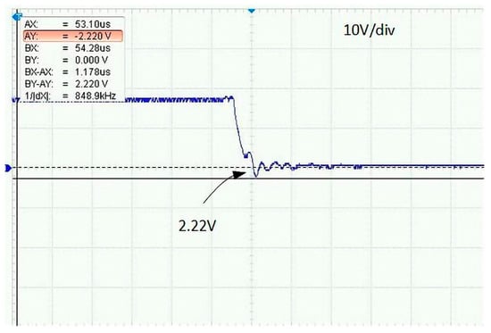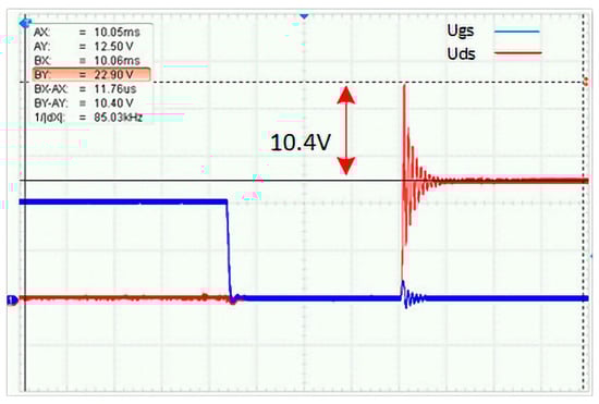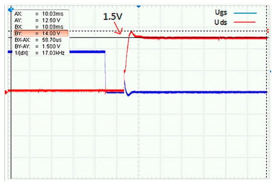 The gate-source voltage and the drain-source voltage signals for a conventional gate drive circuit and the proposed driver circuit are shown in Figure 14 and Figure 15. Comparing the results of Figure 14 and Figure 15, after improving the driver circuit, the oscillation and the voltage spike amplitude have been mitigated from 10.40 V to 1.50 V.