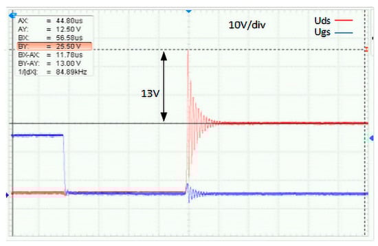 Figure 16 shows that the negative voltage spike at switching frequency 10 kHz is less than when the switching frequency is 50 Hz with 2.22 V and 2.50 V, respectively. The gate-source voltage Vgs and drain-source voltage Vds waveform are shown in Figure 17 under switching frequency fs = 10 kHz. The voltage spike is raised to 13 V with high oscillation for the drain-source voltage. By increasing the switching frequency, the voltage spikes and the overshoot oscillation are increased on drain-source voltage Uds. However, the negative voltage spike at VS pin is decreased when the switching frequency increases.