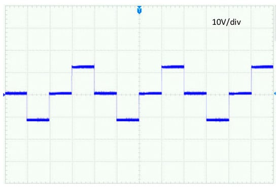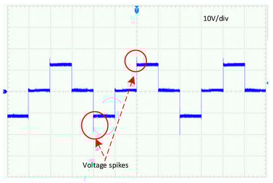 The experimental prototype in Figure 10 has been utilized to verify the proposed scheme’s effect for the output voltage waveform of the H-Bridge inverter. Figure 18 illustrates the output voltage waveform with the conventional gate driver circuit before improving the driver. The output voltage signal is affected by the positive and negative voltage spikes, which lead to more issues for power transistors and the load system.