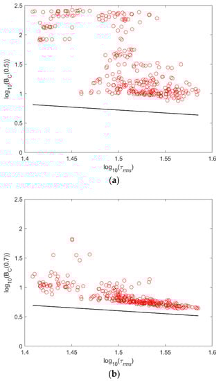 In the case of mobile radio channels, it is common practice to measure the duration of the channel response in the delay time domain using the root mean square (RMS) delay spread (τrms), which is calculated as the square root of the second central moment of the PDP [8]. It is straightforward to demonstrate that the FT of the PDP is the autocorrelation of the time-variant transfer function H(t,f) with respect to the variable f, as already shown in Equation (5). The duration of the autocorrelation function is usually measured by the BC at different correlation levels. Therefore, these two parameters, τrms and BC, will maintain an inverse relationship between them according to the compression properties of the FT.