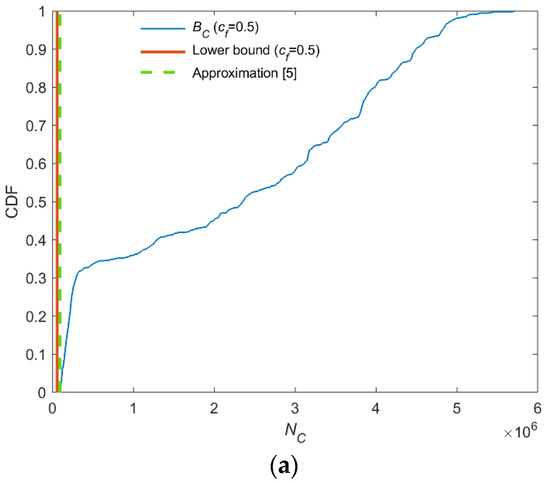 Analysis with experimental results of both the lower bound proposed and an approximation given in [5]. Cumulative distribution function (CDF) of the NC = BCTC considering the values of BC obtained from indoor channel measurements [20] for different frequency correlation levels, cf (ct = 0.7). (a) cf = 0.5. (b) cf = 0.7. (c) cf = 0.9.