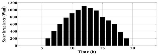 Here, the modeling of the uncertainty for the solar irradiance, wind speed, and load demand is explained. The generation of the probabilistic models for a unit of PV and WT as well as the load demand was based on the hourly historical data of the location under research. Three years of hourly historical data for wind speed, solar irradiance, and load demand have been considered in this work. The three years are represented by a day throughout these years (24 h). The probability distribution function (pdf) of each time segment can be achieved using the data associated with the same hours of the day. Consequently, each time segment has 1095 solar irradiance, wind speed, and load demand (3 years × 365 days per year), generating the equivalent hourly pdfs. The probabilistic model of the PV system, WT, and load demand can be given as follows.