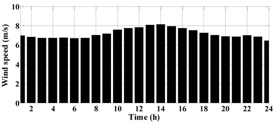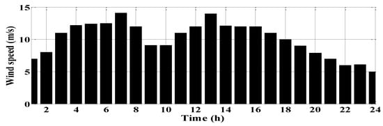 The power generated by a WT depends on the value of the wind speed and the turbine’s characteristics. The wind speed is frequently modeled by using Weibull pdf with shape parameter equalling 2 [33,40], and it is called Rayleigh pdf [41]. Hence, here, the historical data of hourly wind speeds were utilized to create the Rayleigh pdfs () for each time segment, which could be computed as follows: