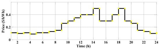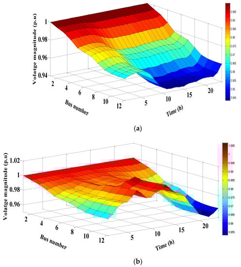 In this case, the proposed algorithm has been applied to solve energy management by considering the variations of the load demand, the wind speed, the solar irradiance, and the market price at deterministic conditions. The hourly load profile is shown in Figure 3. The hourly solar irradiance and the wind speed are depicted in Figure 4 and Figure 5, respectively [44]. The time-varying market price is shown in Figure 6 [45]. Table 4 shows the simulation results for this case by application EO, WOA, and SCA. Without incorporating the RERs, the total cost, the summation of the voltage deviations, and the stability index are 8.56007 × 105 $, 7.94398 p.u., and 2.33983 × 102 p.u., respectively. The voltage profile without incorporating the RERs is shown in Figure 7a. The voltage decreases with increasing the load demand during the day ahead and the minimum voltage magnitude occurs at the 12th bus.
