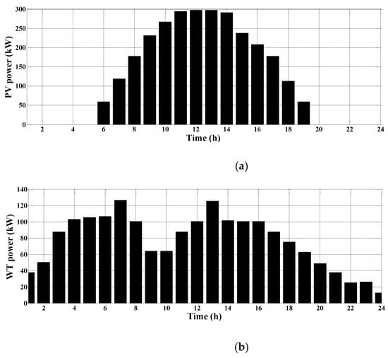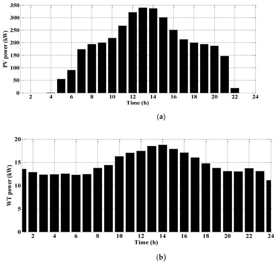 where is the purchasing energy cost from the grid, is the energy loss cost, is the operation and maintenance costs of the PV unit, is the operation and maintenance costs of the wind turbine, is the installation cost of the PV unit, is the installation cost of the WT, is the purchasing cost of the PV unit ($/kW), is the purchasing cost of the WT ($/kW), is the interest rate of capital investment of the installed PV or WT, is the lifetime of the PV unit or the WT, the capital recovery factor, is the hourly output power of the PV system, is the rated power of the WT, and is the rated power of the PV unit. The output powers of the PV units and the WT are calculated using (11) and (12) as following [33]: