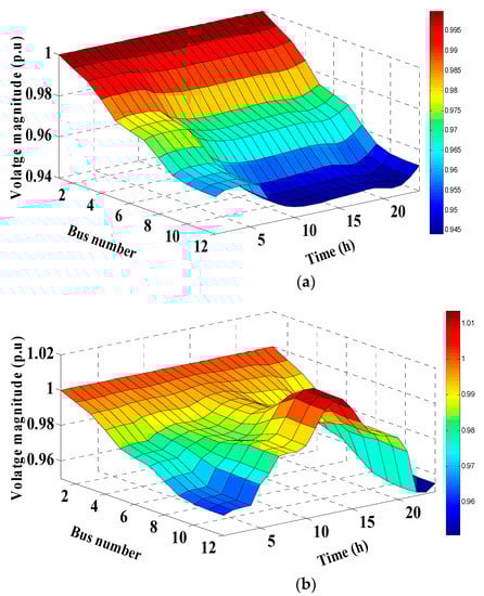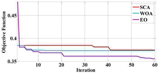 Judging from Table 4, the obtained results by applying the EO are better than SCA and the WOA in terms of the considered objective functions. By optimal integration of RERs in the MG using EO, the power total cost is reduced to 4.27794 × 105 $, the summation of the voltage deviations is reduced to 3.3260 p.u. and the summation of the voltage stability index is enhanced to 2.515199 × 102 p.u. The optimal sizes and placement of the PV and WT are listed in Table 4. The voltage profiles for this case are depicted in Figure 8. It is clear that the voltage profiles are enhanced considerably with the optimal integration of the RERs.