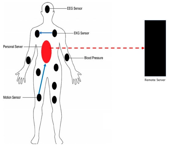 Wireless Body Area Networks (WBAN) are a wearable sensing and monitoring node with some processing and computing abilities. The primary purpose of WBAN is to improve the quality of life. Network sensors are either implanted or placed on the subject’s body. Each sensor consists of a sensing element, an analog-to-digital converter, wireless communication stack, processor, and memory. WBAN nodes can be divided into two types based on processing abilities. The first type is sensing and monitoring nodes, which are used to collect physiological and contextual data []. The second type is the sink node or sometimes called a personal server (PS), which is considered the most powerful part of the network in terms of processing, power, and storage. A personal server is mainly used as a network gateway (i.e., connects the network to the internet). WBAN uses wireless technology to enable sensor communication. The currently used wireless technology standard is IEEE 802.15.6. The connection within a WBAN (i.e., between two nodes or between nodes and PS) is called intra-WBAN communication. On the other hand, the connection between PS and remote server through the internet is considered inter-WBAN communication. Figure 1 shows a WBAN contains two types of nodes, PS and physiological signal sensors. The sensors cannot send any data to a remote server except through PS.