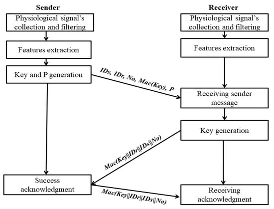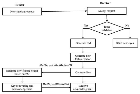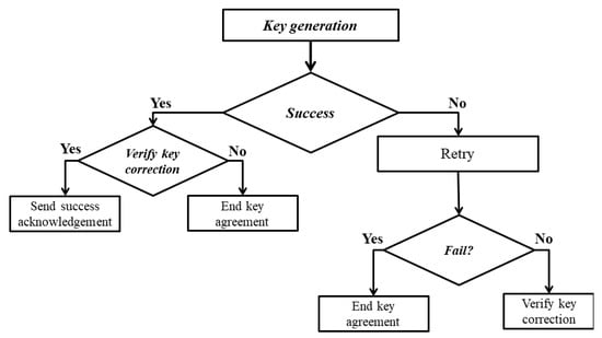 If the two hashes did not match, the connection request is ended, and the new key cycle will be started. If the process of key generation failed at the receiver, the receiver retries to regenerate the key for one more time. If failed, the key agreement process will be ended, and the two communicating sensors’ authentication will be failed. Figure 6 illustrates the key generation process.