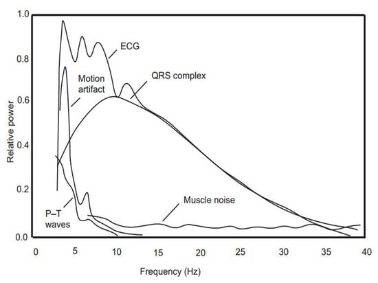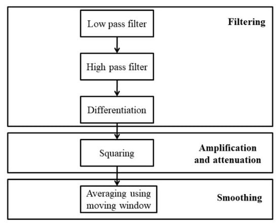 Muscle artifacts are high-frequency noises, while motion artifacts are low-frequency noises. ECG noises can be removed using the Pan–Tompkins algorithm [] (see Figure 5). The Pan–Tompkins algorithm is an ECG signal filtering algorithm. It highly depends on the fact that the QRS portion consumes the most power of the ECG signal. So, it is amplifying QRS while reducing the rest of the signal portions along with noises.