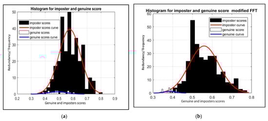 Histogram for the imposter and genuine scores; (a) the proposed method with original FFT, (b) the proposed method with modified FFT.