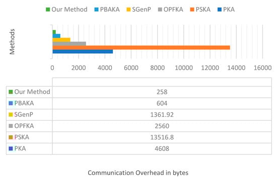 As shown by the message size column, all the presented fuzzy vault schemes have variable length factor NFV. The average length of NFV is 1000 to 3000. So, the message size is 4.5 KB and 13.2 KB, respectively. For the SGenP algorithm, the message size is 1.33 KB, and for the PBAKA method, it is 604 bytes. The proposed method has superiority over fuzzy vault schemes since message size is fixed and there is no variable-length NFV parameter. The proposed method also has superiority over SGenP and the PBAKA method since its communication cost is 258 bytes for both the first and later communication stages combined. Figure 9 illustrates the total communication overhead in bytes for our method and other methods.