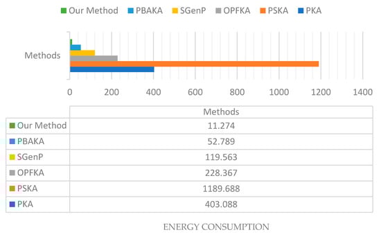 - Energy consumption: The sensor consumes 28.2 mJ to receive one byte and 59.2 mJ to transmit it []. As shown in Table 7, our algorithm gives the lowest energy consumption. We used the message size calculated earlier by communication overhead and calculates how many bytes will be transmitted and received during the agreement cycle. After counting the bytes for each method, we calculated the energy consumed, as illustrated by Table 7. Table 7 shows that the proposed method has the lowest energy consumption compared to other methods. The values of NFV are 1000, 3000, and 1000 for PKA, PSKA, and OPFKA, respectively. The value of Fs and Fr is 100.