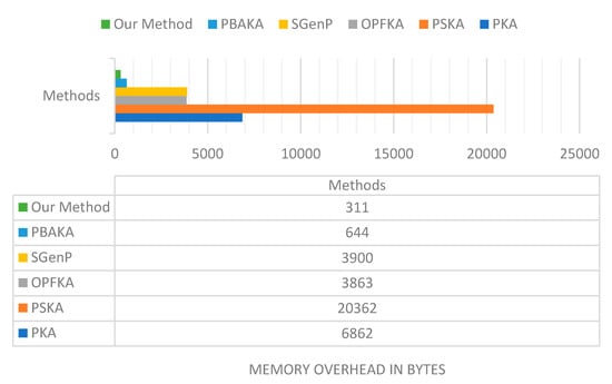 This mainly because the proposed method has a fixed message size in both first and later connections. The only part of the proposed method stores is the feature vector for the first connection and the feature vector. The timer validation period for the later connections. The fuzzy vault methods such as PKA, PSKA, and OPFKA; need to store variable-length parameter NFV. NFV vector has an average length of 1000 to 3000 data points. Each point is represented by 1.5 bytes. The memory cost for IDs and IDr is 16 bytes each. No is 16 bytes, I and permutation matrix PM are at most 1 byte., P is 1 byte, and MAC is 16 bytes. The value of NFV is 1000 for PKA and OPFKA, and its value is 3000 with PSKA. Each NFV point is represented by 1.5 bytes. For SGenP, HMAC is 600 bytes, and the random string is 20 bytes in length. In PBAKA analysis, Fs and Fr lengths are 100, and Ts, Tr, r, s are 20 bytes each. The total memory overhead per connection in bytes is 6862, 20362, 3863, 3900, and 644 for PKA, PSKA, OPFKA, SGenP, and PBAKA, respectively. For the proposed method, communicating sensors will save their feature vector. We will denote it as F; F is much smaller than NFV (i.e., F << NFV), and its size is about 100 features. The first connection’s total memory cost is 311 bytes and is 312 bytes for the later connections. Figure 11 illustrates the memory overhead in bytes for our method and the other methods for the first connection.