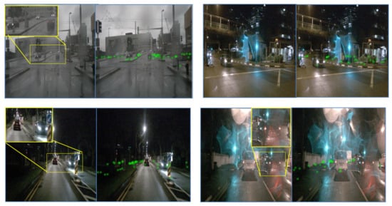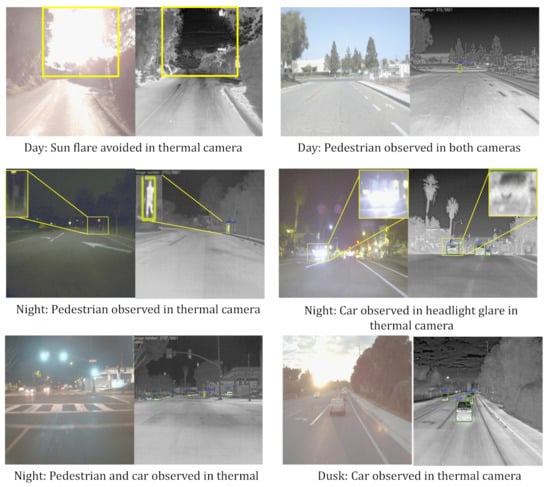 The FLIR dataset contains a day subset and a night subset. The day subset contains 3714 training and 1438 test samples. The night subset contains 3670 training and 1482 testing samples. The dataset contains scenes from daytime and nighttime (Figure 2).