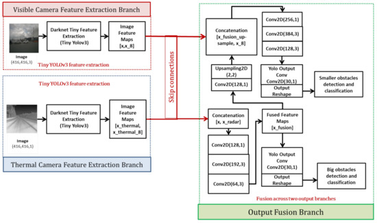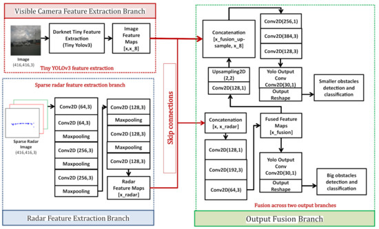 Output Branch: The features extracted from the sparse radar image and the visible camera are transferred to the output branch using skip connections. The individual feature maps are concatenated with each other at various levels in the output branch. The output branch based on the tiny Yolov3 model contains two sub-branches. The first sub-branch detects small and medium-sized obstacles, and the second sub-branch detects big obstacles. The output branch uses multiple 2D convolution filters and reshapes layers.