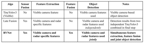 The second baseline algorithm is a late fusion-based object detection network, where the results obtained from independent radar and vision object detection pipelines are combined in the final stage. The visible camera pipeline is a tiny Yolov3 network modified as a binary classifier. The radar pipeline is a rule-based classifier, where radar’s velocity is used to identify the centroids of obstacles. In the absence of obstacle bounding box information, a pre-defined bounding box is generated around the detected centroids. The difference between the baseline and the RVNet is summarized in Figure 6.