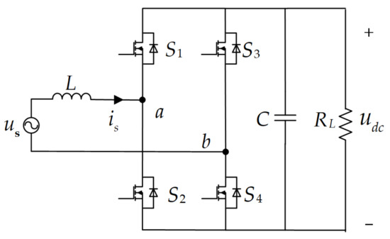 The single-phase PWM rectifier consists of a filter inductance, four switches, and a DC-link capacitor, as shown in Figure 1. Where represents the input AC voltage, represents the input current, L represents the filter inductance, to represent four switches, and are defined as leg a, and are defined as leg b, and C is the DC-link capacitor, is the load resistance, and is the DC-link voltage.