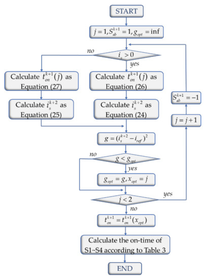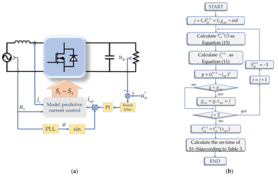 Figure 5b is the control flow chart of the inner current controller. First, the sampling values of AC voltage and input current are substituted into Equation (15) to calculate . Then is substituted into Equation (11) to calculate , and then and are substituted into Equation (13) to calculate the value of cost function. By comparing the value of the cost function under the two effective vectors, the effective vector corresponding to the smaller value of the cost function and its optimal action time are selected. Finally, the on-time of each switch is calculated and output according to Table 3.