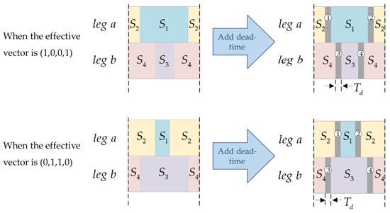 In the switch state after adding dead-time in Figure 6, when the effective vector is (1,0,0,1), the regions of label 1 and label 4 in the figure originally belong to the effective vector’s action time, and label 2 and label 3 originally belong to the zero vector’s action time; when the effective vector is (0,1,1,0), the regions of label 1 and label 4 in the figure originally belong to the zero vector’s action time, and label 2 and label 3 originally belong to the effective vector’s action time. Therefore, after adding dead-time, the effective vector and zero vector’s action time are reduced by respectively.