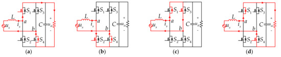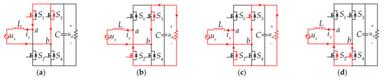 It can be seen from Figure 6 that there are four kinds of switching vectors during the dead-time, which are (1,0,0,0), (0,1,0,0), (0,0,1,0), and (0,0,0,1). For the four switching vectors, only one switch is turned on, so the anti-parallel diode of the other switch must be turned on and freewheel. Combined with the current direction, the current paths under these four switching vectors can be determined, as shown in Figure 7 and Figure 8. Figure 7 and Figure 8 are the cases when the input current is greater than 0 and less than 0, respectively.