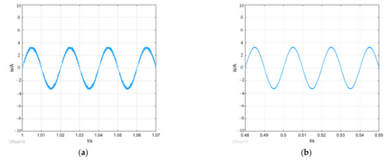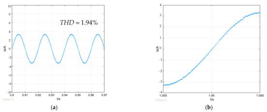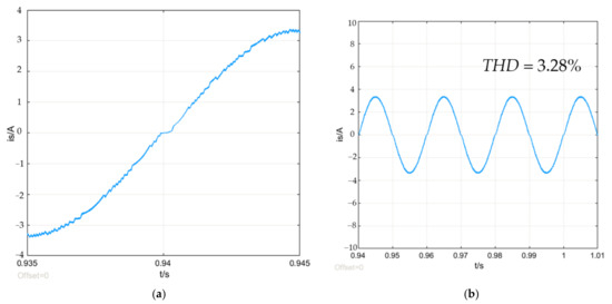 In order to make the influence of the dead-time more obvious, simulation was performed after adding the dead-time of 6 µs. Without dead-time compensation, the current waveform obtained is shown in Figure 12. It can be seen that the current waveform has been significantly distorted, and a relatively long clamping time occurs when the current crosses zero, and the current THD has increased to 3.28%.