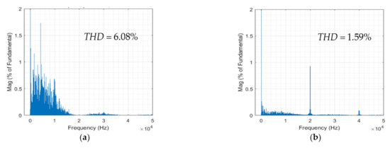 Figure 10 shows the current waveforms of the proposed MPCC and FCS-MPC without adding the dead-time, and Figure 11 shows the FFT analysis results of the current waveforms. The results show that the current of FCS-MPC contains a large number of low-order harmonics, the current harmonics of the proposed MPCC are mainly concentrated at the switching frequency and its multiples, and there are fewer low-order harmonics, which greatly reduces the current THD.