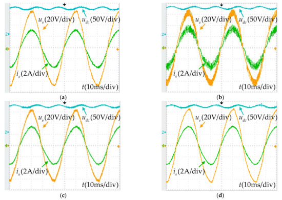 Experimental waveforms of AC voltage, input current, and DC-link voltage. (a) PI-ICC; (b) FCS-MPC; (c) MP-DPC; (d) the proposed MPCC.