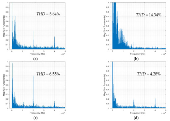 FFT analysis of the input current. (a) PI-ICC; (b) FCS-MPC; (c) MP-DPC; (d) the proposed MPCC.
