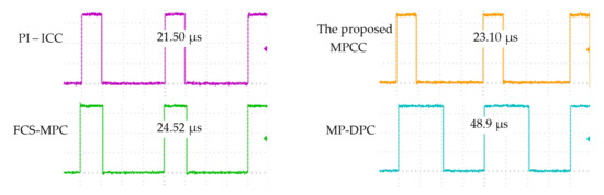 Figure 17 shows the comparison of the execution time of these four algorithms. The algorithm is calculated in the interrupt program of the digital signal processor (DSP). Configuring a General-purpose input/output (GPIO) port of the DSP as an output port, set it to 1 at the beginning of the program, clear it at the end of the program, and set the interrupt cycle to 100 µs. Then, the time when the output of the GPIO port is high is the execution time. The PI-ICC scheme’s inner controller adopts PI controller, which only requires one calculation, so the execution time is the shortest; the proposed MPCC needs to perform two cycles to calculate the predicted current value, and its execution time is slightly longer than the PI-ICC scheme; FCS-MPC needs to perform at least three cycles to calculate the predicted current value, so its execution time is longer than the proposed MPCC; compared with the proposed MPCC, MP-DPC requires additional coordinate translation and coordinate transformation of AC voltage and current to calculate active and reactive power, so its execution time is the longest, which is close to 2.1 times the execution time of the proposed MPCC.