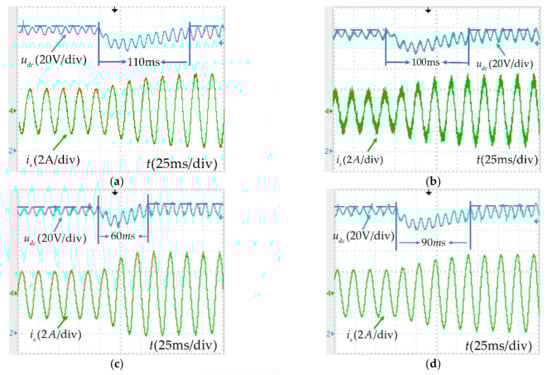 Experimental waveforms of the dynamic response of DC-link voltage. (a) PI-ICC; (b) FCS-MPC; (c) MP-DPC; (d) the proposed MPCC.
