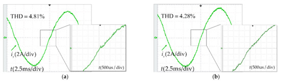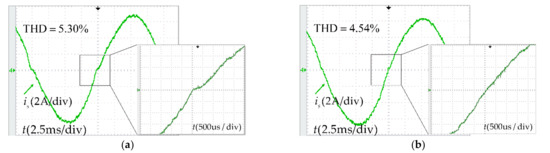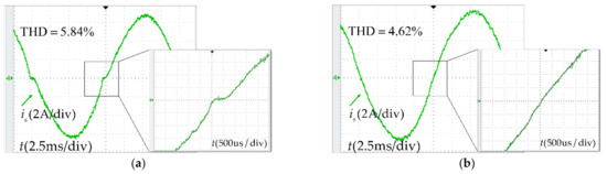 Experimental results show that without dead-time compensation, as the dead time increases, the zero-current clamping effects become more obvious. When the dead-time increases from 2 µs to 6 µs, the clamping time increases from 200 µs to 500 µs, the current THD increases from 4.81% to 5.84%. After adding the dead-time compensation, the current waveform has no obvious distortion under different dead-time, basically no clamping time, the current THD is kept at a low level. PF was measured online by a power meter. The accuracy of the power meter is ± (0.4% reading + 0.1% range + 1 word), and the range is (−1.000~1.000). From the results, within the error range, under the dead-time of 2 µs to 6µs, both uncompensated and compensated schemes can achieve high power factor.
