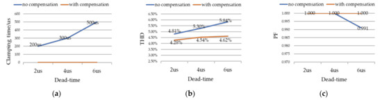 Graph of the relationship between dead time and: (a) Clamping time; (b) THD; (c) PF.