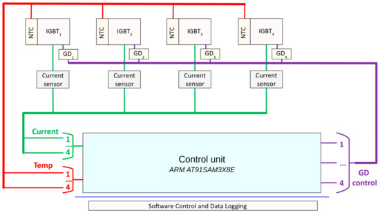 An initial design idea for the test board was to develop a test model on which different temperature control algorithms could be tested. Thus, four IGBTs were installed on the developed test board as a minimal set requirement for two developed algorithms, which are presented later in the paper. The block schematic of the test model is shown in Figure 1. Here, four IGBTs (IGBT1–IGBT4) are utilized. IGBT drivers (GD1–GD4) are connected to every IGBT on one side and to the control unit on the other side. Each IGBT has its own NTC temperature sensor Cantherm MF58 (Quebec, Montreal, Canada) and current sensor (transducer) LEM LTS 25-NP (Wisconsin, MKE, USA). The development board with a 32-bit ARM AT91SAM3X8E Arduino DUE (Torino, Italy) microcontroller was used as a control unit [28]. The used development board is restricted to sixteen analog inputs (current and temperature readings), which is acceptable for the assembled test model (four current and four temperature readings). IGBT drivers are controlled with digital outputs. An auxiliary power supply of 12 V and 3 A was used as a power supply for the test model.