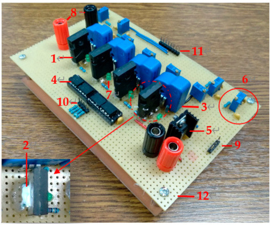The test board was supplied with +12 V and +5 V stabilized power source for drivers and sensors (mark 5; Figure 2). The +5 V stable voltage source is crucial for precise current and temperature measurements. Further, every current and temperature sensor has its own active circuitry for calibration and fine adjustments realized via multiple-turn trimmers (mark 6; Figure 2) and other passive components to ensure reliable measurements.