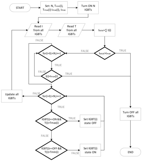 In this study, two algorithms were developed for basic IGBT load balancing via temperature control—Nsim and NNr. The basic schematic of both Nsim and NNr algorithms is shown in Figure 3. These two algorithms are chosen to show two different but similar simple methods of paralleled IGBT temperature control (one without and one with redundant IGBTs) and to validate both methods.