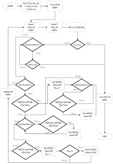 The basic working principle of NNr is that the user first selects the N number of main IGBTs and Nr number of redundant IGBTs (Figure 3). Redundant IGBTs are simultaneously engaged when any of the main IGBTs reaches T2(i). They remain active until all individual IGBTs from the main group of IGBTs cool down (reaches T1(i)). At this point, redundant IGBTs are deactivated and only the N main IGBTs conduct again. This algorithm ensures better stability of the system but also requires a greater number of IGBTs due to redundancy. The flowchart of the NNr algorithm is given in Figure 5.