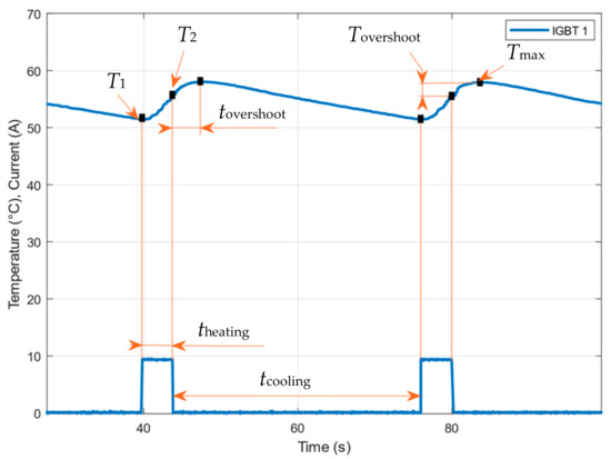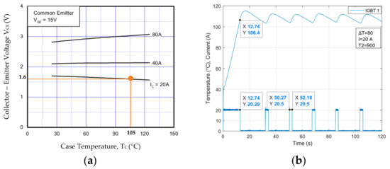 Because this paper addresses temperature and current as the two main observed variables, the current-temperature characteristic is discussed prior to measurements. The only current-temperature correlation characteristic available from the Fairchild SGH80N60UFD datasheet [29] is extracted and shown in Figure 10a. In Figure 10b, the recorded current and temperature characteristic of a single IGBT for the chosen parameters of T2 = 105 °C, I = 20 A, and ΔT = 80 is shown.