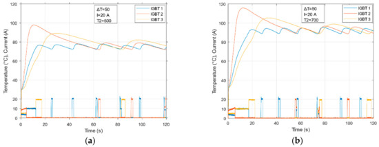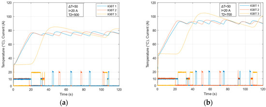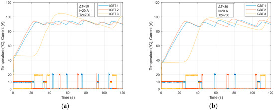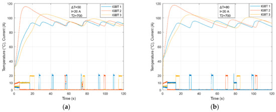 Upper threshold temperature (T2) influence on three paralleled IGBTs for (a) T2 = 74 °C; (b) T2 = 90 °C.