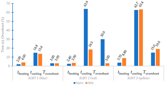 Because this paper addresses temperature control, three measured values, namely heating time, cooling time, and overshoot, directly depend on IGBT thermal conditions. Pursuant to Table 5 and Table 6, a chart is presented (Figure 15) for both Nsim and NNr algorithms for the chosen parameters of T2 = 90 °C and ΔT = 80 which compares the three most important measured values.