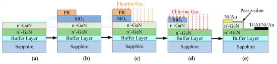 Simplified fabrication steps of the vertical GaN SBD. (a) Epitaxy structure of vertical GaN SBD on sapphire substrate; (b) photoresist (PR) and SiO2 mask on GaN; (c) fluorine-based hard mask etching; (d) chlorine-based mesa etching; (e) electrode deposition and SiO2 passivation.