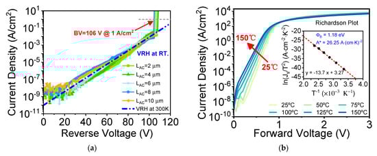 Figure 4a shows the reverse I-V characteristics of the GaN SBDs with various LAC at room temperature. The GaN SBDs with various LAC showed a similar breakdown voltage (BV) of 106 V at 1 A/cm2 and a similar leakage density of 10−8 A/cm2 until –30 V. LAC had minor impact on reverse BV, which can be explained by the electric field distributed mostly in the drift layer. When the reverse bias exceeded 30 V, the leakage behavior showed a variable range-hopping (VRH) process, which could be attributed to the threading dislocation in the bulk []. Figure 4b shows the temperature-dependent I-V characteristics of the SBDs, which ranged between 300 and 425 K. With increasing temperature, the current density increased from 300 K (room temperature) to 425 K when the forward voltage was below 1 V, which was attributed to the thermionic emission (TE) behavior. However, the current density decreased with temperature at high forward bias (>1 V), mainly attributed to a decrease of electron mobility in the drift region. Thermionic emission behavior can usually be proved by a Richardson plot as follows [,]: