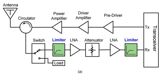 Finally, a multi-stage limiter based on GaN PiN diodes and GaN SBDs can reduce the leakage power and adjust the threshold level []. Monolithic and microwave integrated circuits (MMICs) offer the possibility of integrating the multi-stage diode limiter, enabling a better limiting performance with high power handling at a high-frequency band.