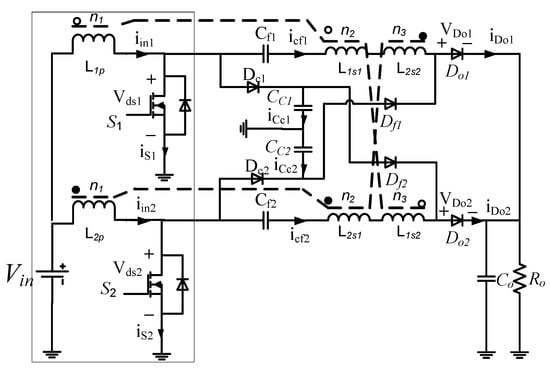 - Matsuda, A.; Koizumi, H.; Sato, T. Two-stage interleaved DC-DC converter with input-parallel output-series connection. In Proceedings of the IEEE International Symposium on Circuits and Systems (ISCAS), Sapporo, Japan, 26–29 May 2019; pp. 1–5. [Google Scholar]