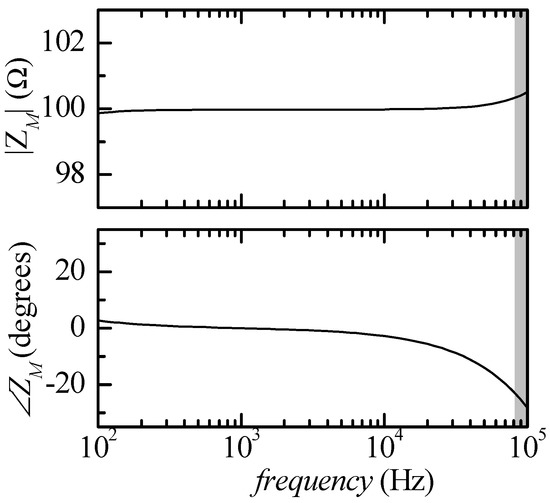 When performing impedance measurements with the approach outlined in Figure 1, the impedance at any given frequency is obtained by evaluating the ratio between the phasors at the outputs of the trans-resistance and voltage amplifiers in Figure 1 (INL and INR). Because of the division, as long as the left and right acquisition channels of the audio board are well-matched (as it is expected to be the case), the detailed amplitude and phase responses of the audio board channels do not introduce errors in the estimation of the impedance. On the other hand, amplitude and phase deviation from the ideal gain of the voltage and trans-resistance amplification chains in Figure 1 can result in significant errors. As an example, let us assume that we are configuring the circuit with all RXSI removed from the circuit (maximum test current about 10 μA rms). We can resort to SPICE simulation to verify what would be the result of measurements in the particular simple case of ZK = RK = 100 Ω, ZAB = RAB = 10 Ω and ZCD = RCD = 10 Ω. The resulting estimated impedance (ZM) according to such a simulation is reported in Figure 2, where the grey area indicates the frequency region outside the measuring capability of the audio board being used (f > 80 kHz).