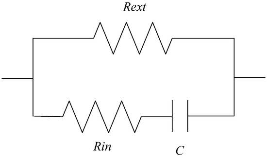 In order to verify that this is indeed the case for the specific application we are interested in, we need to mention that the result of bioimpedance measurement on a knee will be interpreted with reference to the equivalent model in Figure 3 [16], where the resistance Rext and Rint, whose physical meaning will be discussed in the following sections, are expected to range between 30 and 100 Ω and the capacitance C in the range between 10 and 15 nF.