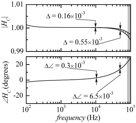 We therefore performed Monte Carlo SPICE simulations by repeating more than 10,000 spice runs with ZK in the form of Figure 3 with random and uncorrelated values, within the expected ranges, for Rin, Rext and C for each run. The correction function HC was evaluated for each set of values in order to check how much it changed depending on the actual ZK being tested. In a first simulation set-up, we performed the test in the same conditions in which Figure 2 was obtained, that is with all snap-in resistances removed from the circuit. The results are summarized in Figure 4. All curves representing the modulus and the phase of the correction functions lie inside two limiting curves: the deviation is however so small that the limiting curves can be distinguished, with the scale used for the figure, only in the case of the modulus and only for frequencies above about 20 kHz. It can be noticed that in the entire frequency range that can be explored (outside the gray areas), the deviation in the modulus of the correction function is expected to be less than 0.2% and, more importantly, the deviation in the phase is expected to be less than 0.03 degrees. This means that any calibration curve obtained from a calibrated impedance (in the possible range for ZK) can be used to obtain a calibration function HC that can be used for all actual measurements with small errors in the estimation of the modulus (less than 0.2%) and an almost negligible error in the phase.