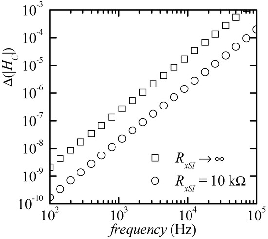 Maximum deviation of the modulus of the correction function HC vs. frequency. The empty squares refer to the same simulation condition in which Figure 4 has been obtained. In the case of the empty circles, the only change was the presence of 10 kΩ snap-in resistances in parallel to RI, R2 and RR in Figure 1.