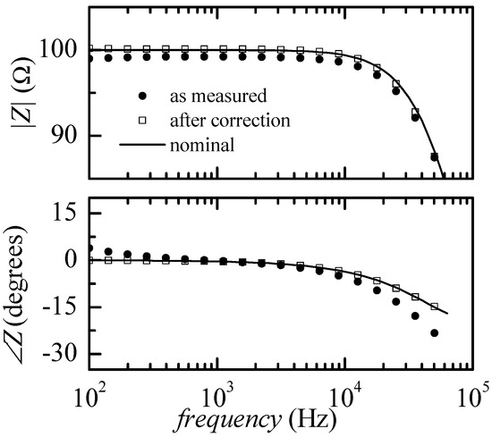 The calibrated impedance does not really need to be in the form of Figure 3, as long as its modulus is within the expected range for the actual measurement. Indeed, we typically employ a single high-accuracy (0.1%) 100 Ω resistor for ZK with ZAB = ZCD = 10 Ω. Using a single resistor greatly simplifies performing the calibration measurement while remaining effective. To demonstrate this fact, we first extracted the calibration function HC from actual measurements on the 100 Ω resistor, and then used HC for correcting the actual measurements on a test impedance in the form of Figure 3, with Rext = 100 Ω, C = 10 nF, Rin = 100 Ω. The results of such procedure are summarized in Figure 6. The measurements obtained without correction (black dots) are shown together with the measurement modified using the correction function HC obtained from a previous measurement on the calibration impedance (empty squares) and with the calculated values for the modulus and the phase of the impedance being tested (continuous black line). As it can be noticed, after correction, the measured values are essentially coincident with the expected ones.