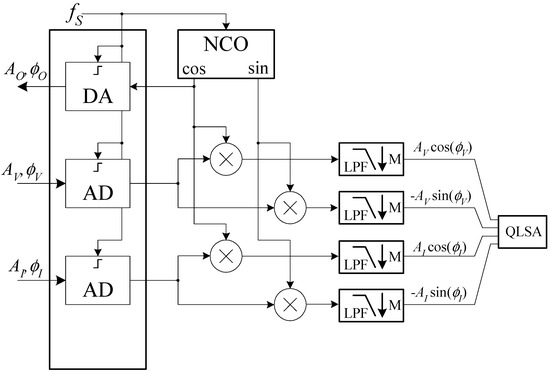 The NCO in Figure 7 is a Numerically Controlled Oscillator working at the audio board sampling frequency. The NCO is based on a 30 bits phase accumulator resulting in a frequency resolution ∆f well below 1 mHz (∆f = 179 μHz). The NCO produces two sinusoidal signals that we will assume to be zero-phase cosine and sine functions with an amplitude of 1 V. The cosine signal generated by the NCO is sent to the audio board, resulting in a voltage signal VO(t) given by: