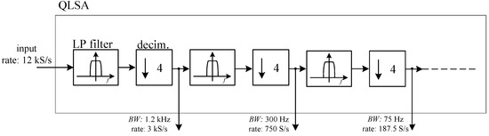 where we have numerically multiplied GR by −1 so that we obtain the same phase for the voltage and the current in the case of a pure resistance for ZK and we have assumed, for the sake of simplicity, real gains independent of the frequency. We have, however, explicitly noted the fact that both the amplitude and the phase of the signals can depend on the time as a result of physiological causes, such as the cardiac activity. Both amplitude and phase changes are expected to be small and occurring over a time much longer than the signal period. After analog to digital conversion, each of the input signals is sent to a coherent demodulator implemented in software, so that their amplitude and phase can be extracted. The cut-off frequency of the fourth-order IIR low pass filters (LPF in Figure 7) is set in such a way that, besides eliminating the high-frequency components at the output of the multipliers, the numerical signal can be decimated by a factor M = 16, thus reducing the data rate from 192 down to 12 kHz. This sampling frequency is largely sufficient to retain the information due to the possible modulation in the amplitudes and phases of the detected signals. At the outputs of the decimation stages, the in-phase and in-quadrature components can be further low pass filtered in order to reduce noise before the estimation of the impedance. Depending on whether or not we want to retain information on the amplitude and phase fluctuations due to physiological activities, we may have to employ different cut-off frequencies to distinguish phenomena occurring in different frequency bands. In order to simplify such a process and to maintain high flexibility in the data elaboration process, we resorted to the QLSA public domain library [26]. While QLSA is mainly intended for multi-channel spectral analysis, as part of its inner working operation, it performs multi-stage low pass filtering and decimation on the incoming signal stream. More precisely, for each input signal sequence, QLSA is used to perform the filtering operations schematically shown in Figure 8.